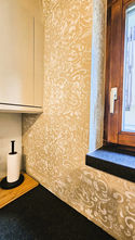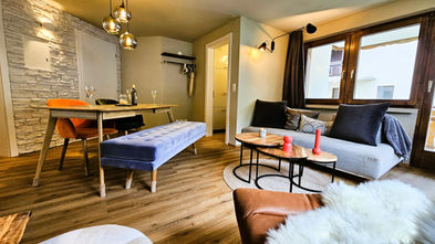 The apartment accommodates up to four guests and offers two bedrooms, each equipped with luxurious box-spring beds (180×200 cm). Every room has its own unique character – one features a creatively designed plaster wall, the other an elegant Swahili-style accent wall. Two stylish bathrooms in Swahili design, a compact kitchen with a custom plaster wall, and a cozy living area with a striking stone feature wall complete the space.